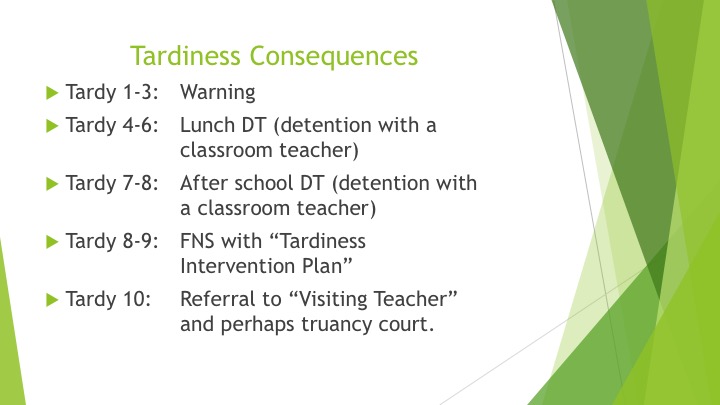 Each quarter we “re-set” the system, and students were understood to again have zero tardies, and they started up the discipline ladder all over again.